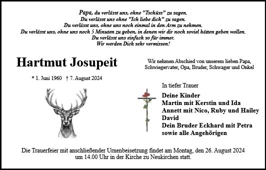 wir wünschen Ihnen von Herzen viel Kraft, dass Sie Menschen um sich haben, die Ihnen in dieser schweren Zeit beistehen und Halt geben. Zusätzlich können Sie auf dieser Gedenkseite Erinnerungen teilen und so das Andenken gemeinsam wachhalten.
